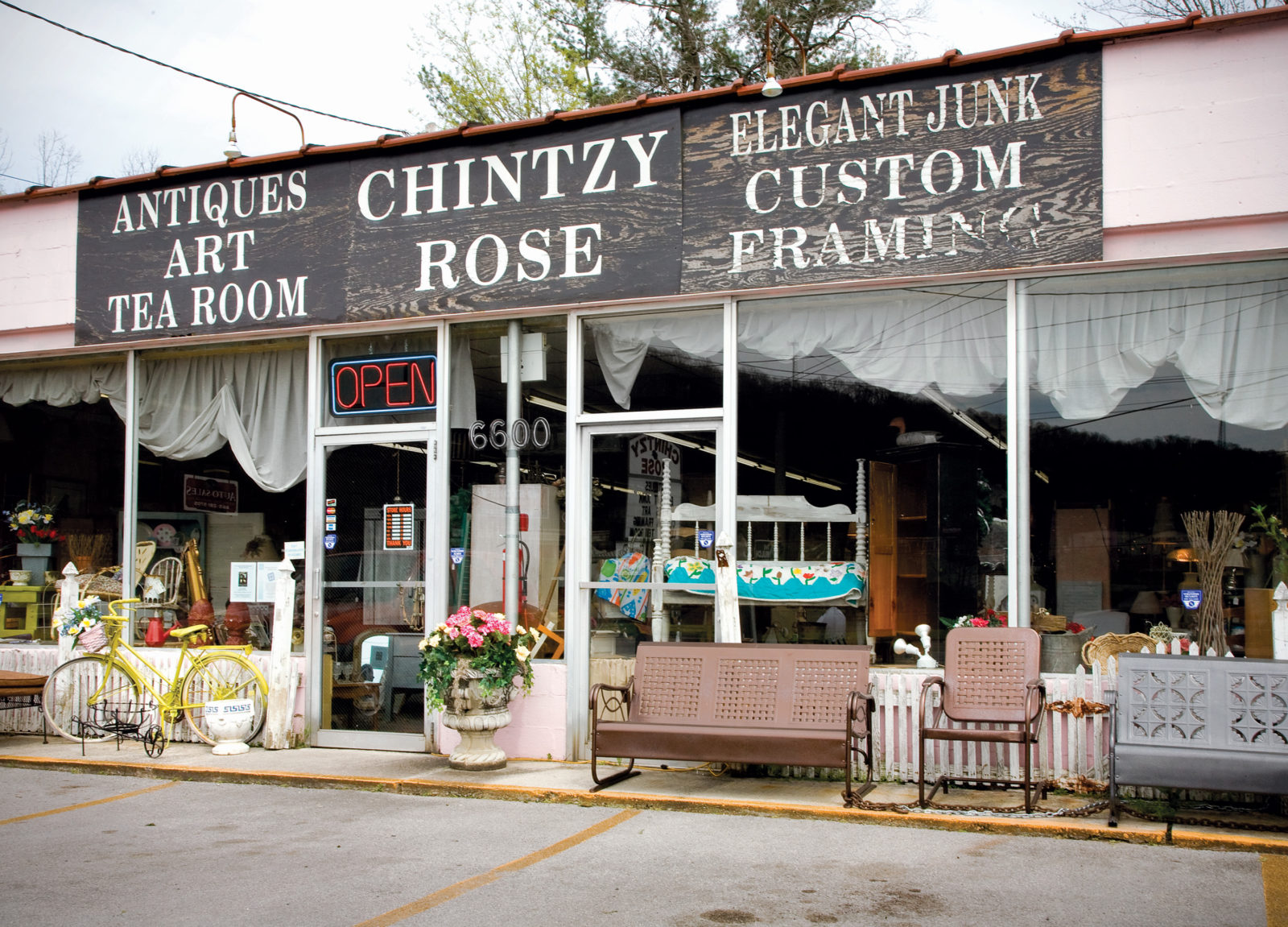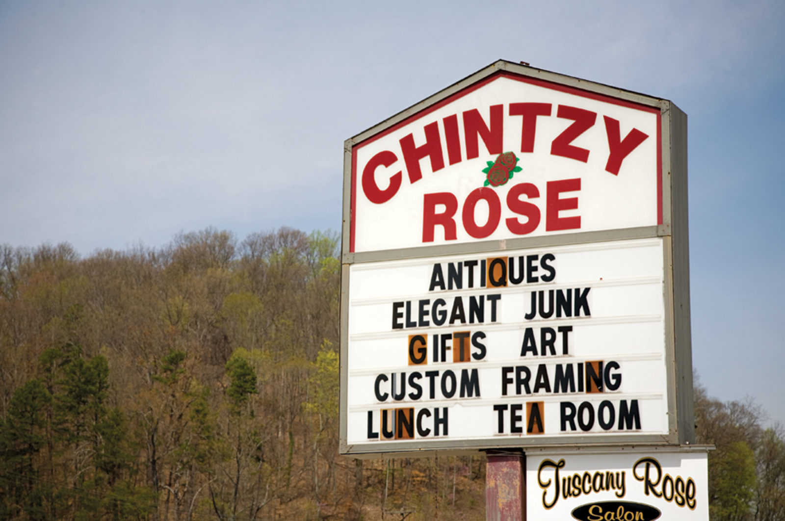 The Chintzy Rose is a side-of-the-road junk shop/café that sells painted furniture and chenille throws along with BBQ and corn chowder. Run by Bobbie Miller and her daughter Kelly Phibbs, it offers superior chicken salad and strawberry cake, but what brings in folks from as far away as Utah is the sweet tea.