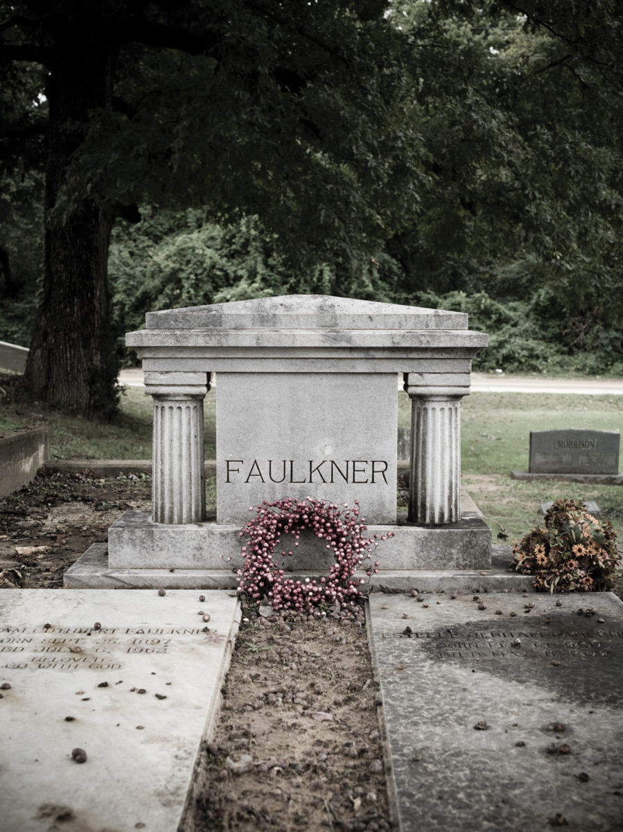 But sometimes now, late at night, when folks walk their dogs or wander home from the bars and restaurants on the Square, and they pass the cemetery, it’s said that there’s another sound, something like the soft, muffled but insistent thud that khakis, old tweeds, and brogans might make tumbling in a clothes dryer. Some say it’s the sound of America’s greatest writer and Oxford’s most famous citizen, William Faulkner, spinning in his grave.