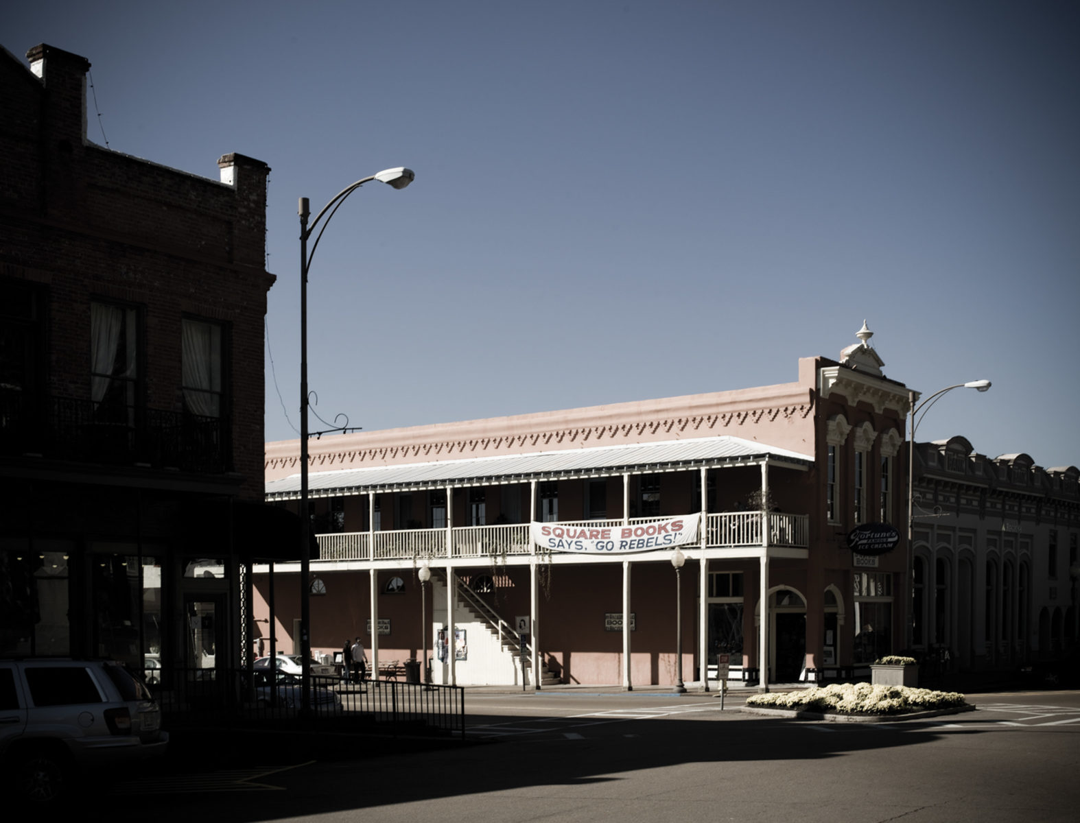 So, by the 1980s Oxford’s golden age was in full swing. Square Books was having readings and book signings, drawing literary lights such as William Styron, Toni Morrison, and Richard Ford. The Hoka had a café and showed classic, cult, and X-rated films, and was a spot where anything might happen, like the memorable night when Allen Ginsberg, after an event at the bookstore, drifted over to the Hoka with his harmonium and performed, ignoring the catcalls and rattling coolers of the frat boys who’d come expecting to see the midnight porn. There was a great music scene as well, with local musicians such as Jojo Hermann, who would eventually play keyboardsin Widespread Panic, and John Stirratt, a founding member of Wilco, playing around town with various musician configurations. Fat Possum Records began seeking out and eventually recording the last of the old hill country bluesmen, most notably Junior Kimbrough and R.L. Burnside. At the same time, at the University of Mississippi, the Center for the Study of Southern Culture, established in 1978, was up and running and attracting scholars and big names who came for programs and to teach courses, like the late New York Times rock critic Robert Palmer. B.B. King, a native Mississippian, donated his record collection as the core of a blues archive, and the center took over publication of a standard in blues scholarship: Living Blues magazine. Barry Hannah, Larry Brown, and John Grisham were all here writing, as was Willie Morris, holding court and teaching journalism. A common sight in those days, too, was Memphis photographer William Eggleston, the father of modern color photography, skulking around town with his camera. It was a wildly rich and highly charged time, when you could hear James Dickey read poetry and still buy a sack of feed corn on the Square. A literary center, but still a real Southern town, too.