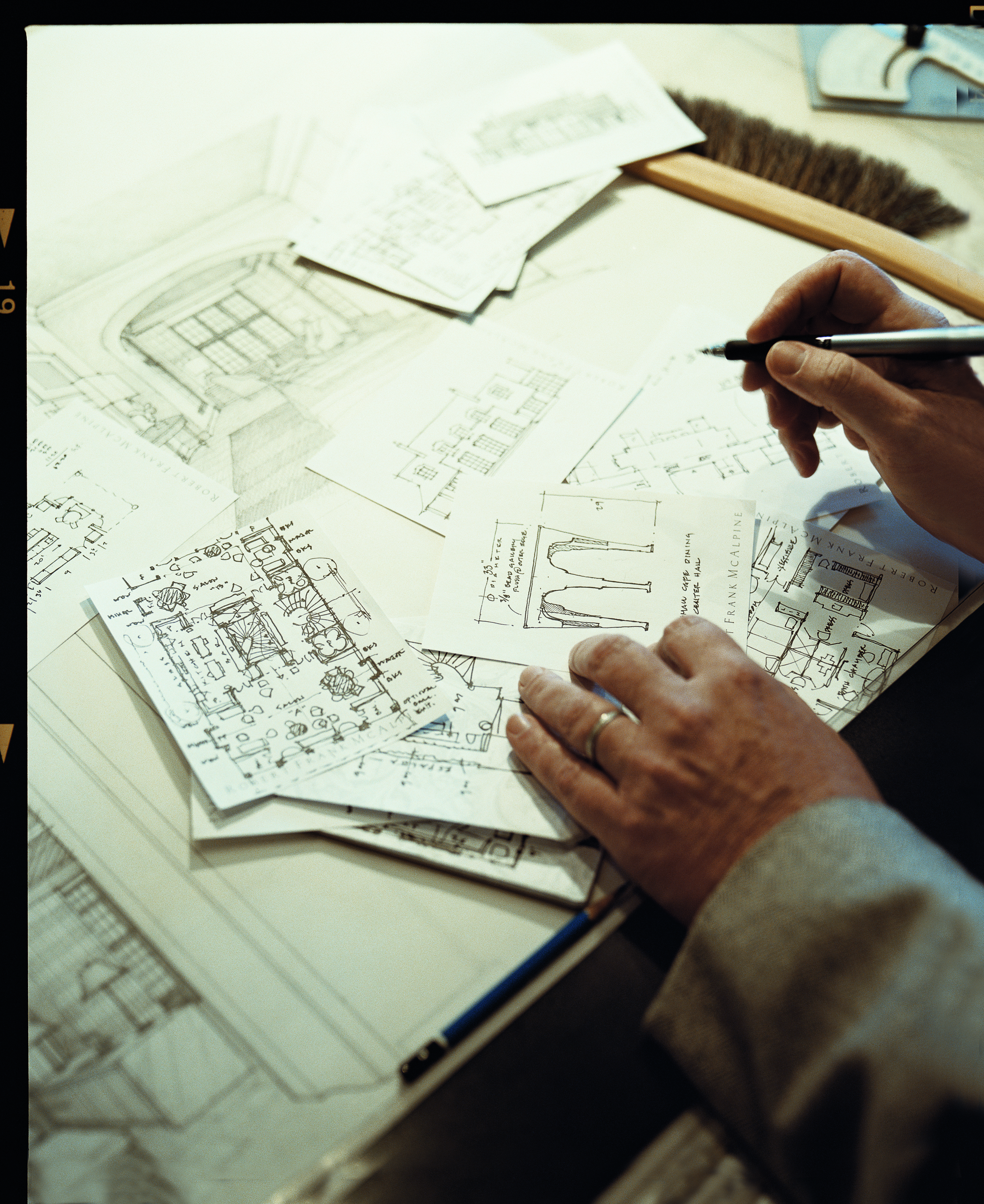 Bobby McAlpine and I were seated at a round conference table at the offices of McAlpine Tankersley Architecture in Montgomery’s Cloverdale neighborhood. Around us, theater curtains spilled from steel rods, giving shape and texture to the cavernous second-floor loft. A dozen or more people leaned over drafting tables, penciling away on broad, crisp sheets of paper. Every home the firm designs is drawn by hand, down to the individual wood roofing shingles on the exquisite scale models. (“It communicates quality,” Greg Tankersley, McAlpine’s partner, later explained. “You can drive down the street and tell which buildings were designed on computer. They have no soul.”) Everything around me was so, well, architectural—and there was Bobby McAlpine showing me a set of crumpled 4-by-5-inch pages, peeled from an everyday notepad and inked to the margins with loosely rendered floor plans of a house for a Tulsa oil prospector. McAlpine, I was surprised to learn, does most of his work back-of-a-napkin-style on telephone notepads.