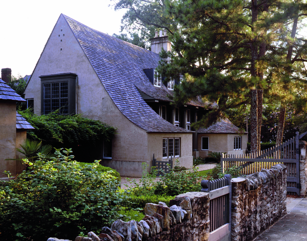 I saw firsthand how McAlpine blends traditionalism and modernism later that day when we parked alongside a stucco cottage with a sweeping shake roof he designed for himself in 1995. Though he sold it in 2004 to one of his junior partners, McAlpine still considers this home something of a self-portrait (see “The Work of Bobby McAlpine,” page 82). At first blush, it looked quite traditional—divided-light windows, chimney pots, even a few Tuscan columns along what I took to be the front facade. But then I realized the front is actually the side, and those columns are actually pilasters flanking towering living room windows and supporting an elegantly cantilevered shed dormer, all of it obscured by a hedge. At either end, massive bay windows project from second-story bedrooms. The designer balanced these grand gestures with the self-deprecating swoop of the roofline—the house “bowing its head a bit so it’s not so confrontational.” The same contrast occurs again inside, where low ceilings in the entry and kitchen feel cozy but the adjacent living room ceilings soar upward, lifting the eye and opening the space.