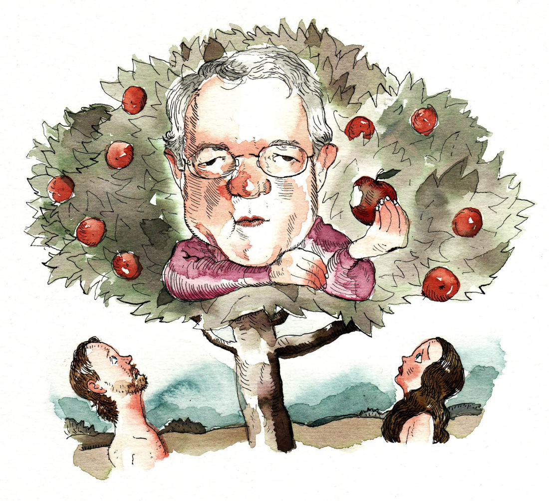 Part of me wants to have hoed with that nice-looking woman. But just thinking about the posture of hoeing  makes the small of my back hurt. In Eden, nobody needed to hoe. Adam and Eve coexisted with the weeds, because trees bearing  fruit abounded. The first couple had dominion over the beasts and the fishes, so hunting and fishing, and milking, and getting past the rooster to gather the eggs, must have been a snap. Until the serpent induced Eve to take a bite from the one forbidden fruit, the apple of knowledge, she and Adam coexisted mellowly with each other, too—lacking any sense of either ooh-la-la, on the one hand, or “Is that all you care about?” on the other. Something to be said for relations such as those, but: