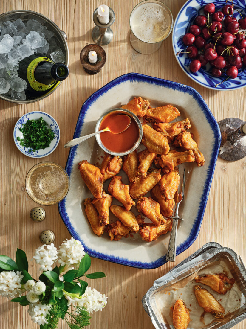Andrew LaMar Hopkins, a New Orleans artist and bon vivant, typically walks over to Manchu Food Store and orders the shop’s locally beloved fried chicken wings. But then he makes them look as sumptuous as the rest of his spread. “I lay them out,” he says, “on my nineteenth-century blue feather-edge platters.”