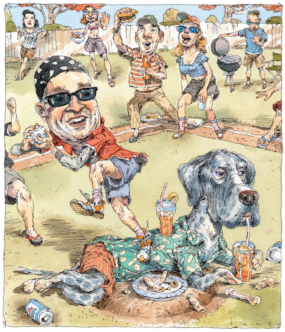 At our annual staff party in the summer, we played an enormously intoxicated game of beer Wiffle ball. There were regularly twenty-five or so people on a side, and music, guns, and fireworks were no strangers to the event. Every year I stood in the infield and pitched to both teams. Every year, Cal lay on the mound at my side, entirely unfazed by the activity.