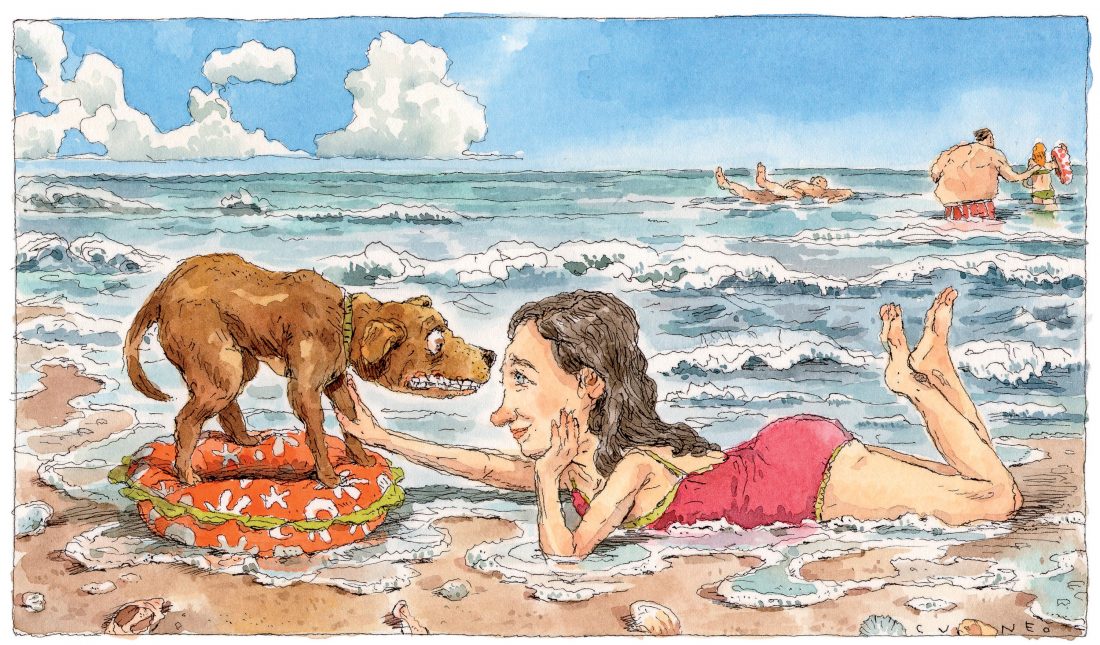 When our privacy was ensured, I sat down next to Ozzie in the warm sand. I began to talk quietly to her about the water, which cloaked our conversation in the classic white noise of the psychiatrist’s office. I told her how much I loved the water, and how good it felt. As I talked, I moved slowly, gently, closer to the tide line. Ozzie huddled next to me. A bit closer, and the water was lapping at my haunches. Ozzie’s attention seemed riveted on my face, as if she knew that something important was about to happen.