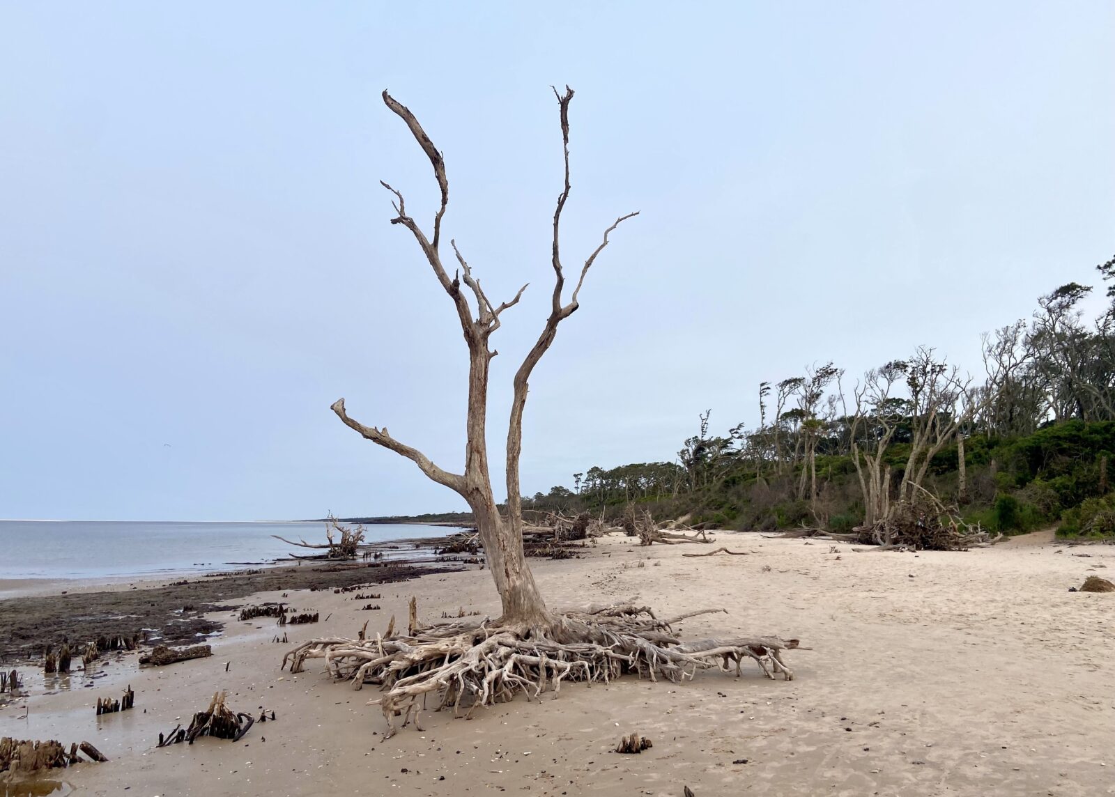 Over time live oaks, palmettos, red cedars, and pine trees alike succumb to the nutrient imbalance and root damage wrought by increased salinity. But even after they die, the trees can remain embedded in the beach for decades, playing a role in storm mitigation and buffering against further erosion.