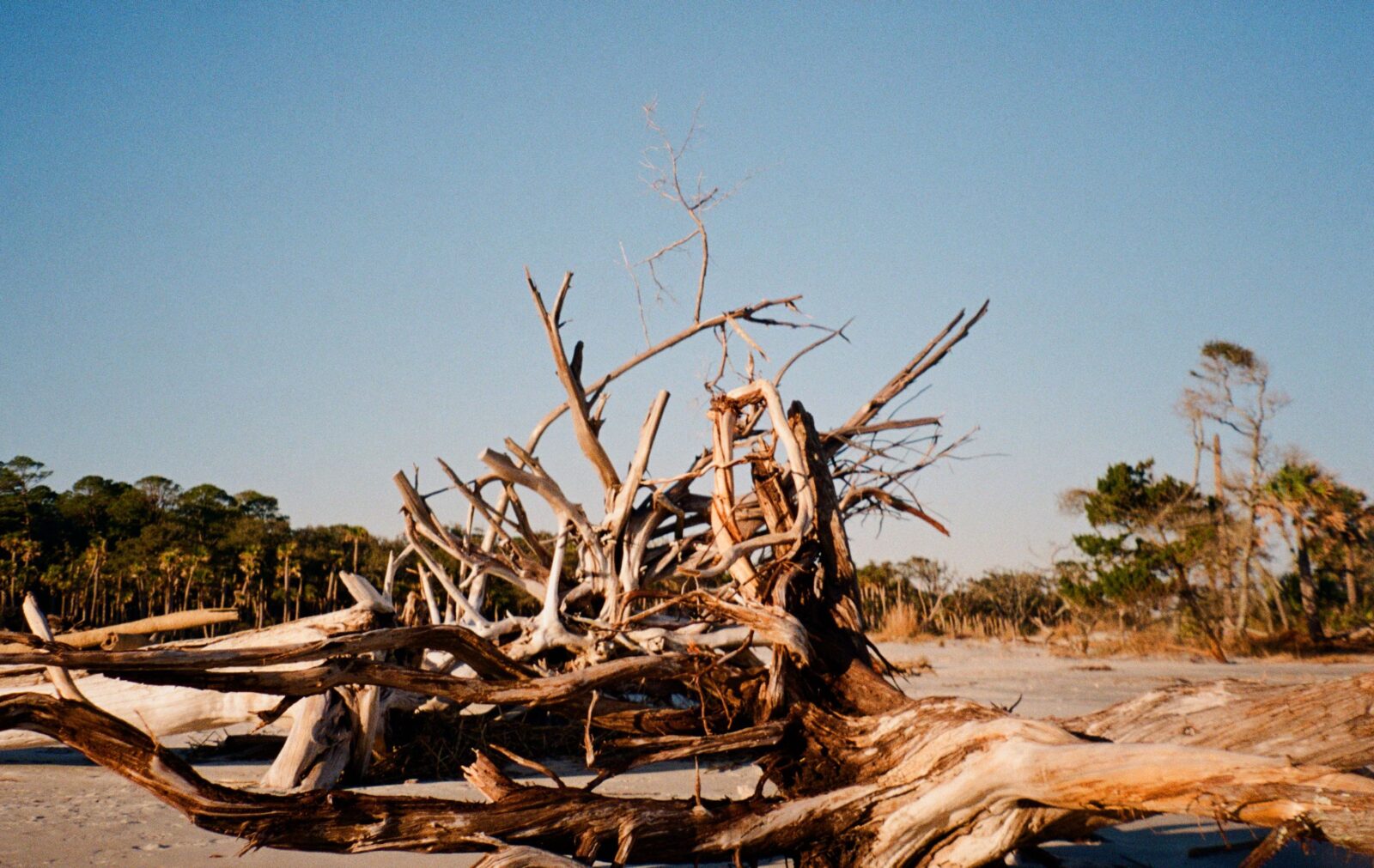 Dotting the Southeastern coast, boneyard—or driftwood—beaches like this one are studies in impermanence. Longshore currents redistribute sand constantly, depositing it in some places while eating away at protective dunes in others. As these latter beaches contract, saltwater creeps beyond the tree line—a natural process hastened by rising sea levels.
