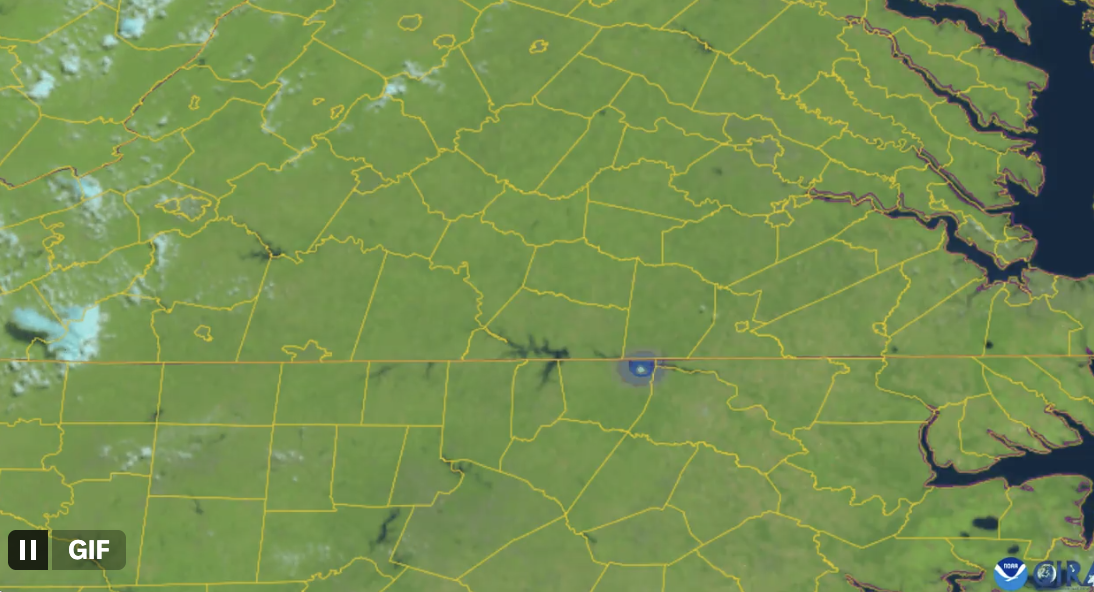 A NOAA satellite image shows the flash of a probable meteor (in blue) near the Virginia/North Carolina border.
